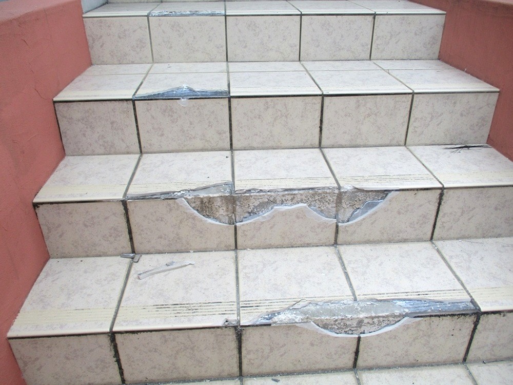 事故で玄関・階段のタイルが破損してしまった為、タイルの張り替え工事を行ないました。